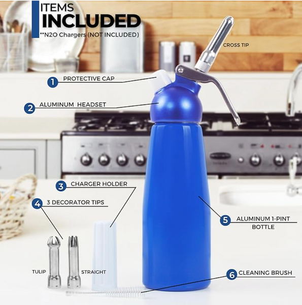 Includes whipper, 3 decorator nozzles, charger holder and instruction manual